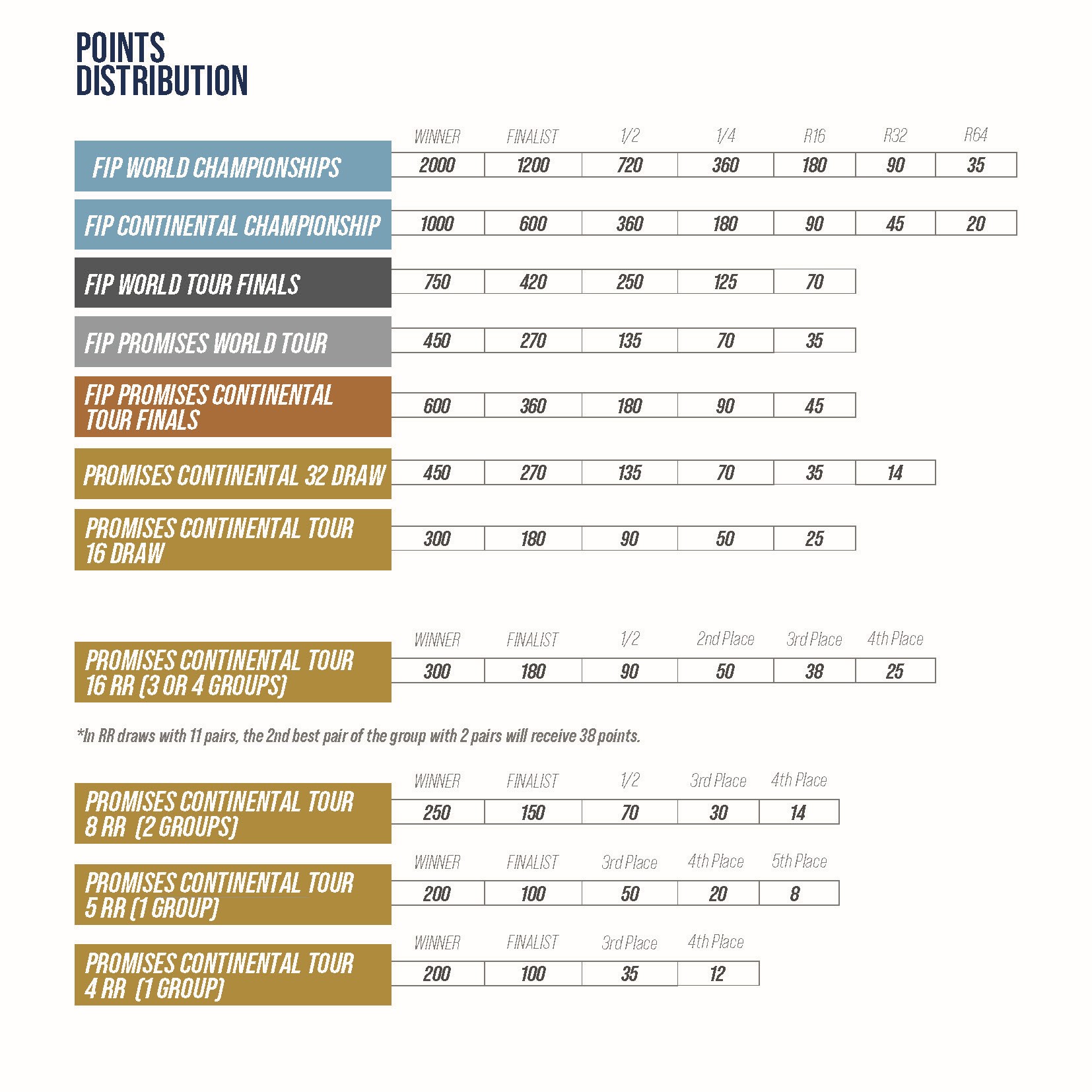 Below is the Points Distribution Chart for FIP Promises events. For FIP Continental Tour events, the amount of points awarded is determined by the size of the draw.